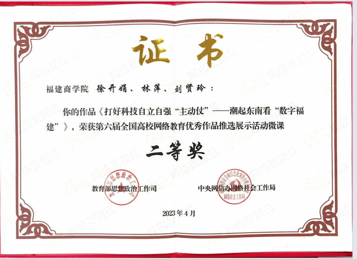 beat365官网徐开娟老师的作品《打好科技自立自强“主动仗”-----潮起东南看“数字福建”》,荣获第六届全国高校网络教育优秀作品推选展示活动微课二等奖。