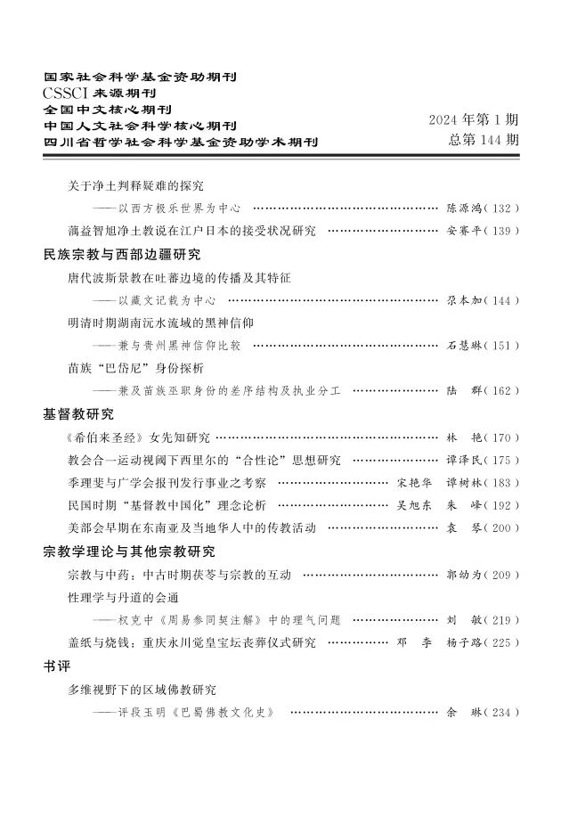 《宗教学研究》是由四川大学道教与宗教文化研究所(宗教学研究所)主办的宗教学专业学术双月刊,创刊于1982年。系国家社科基金资助期刊,CSSCI来源期刊,中国人文社会科学核心期刊,全国中文核心期刊。