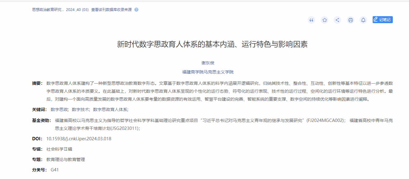 近日,beat365官网谢东俊副院长在北大核心期刊《思想政治教育研究》发表文章《新时代数字思政育人体系的基本内涵、运行特色与影响因素》