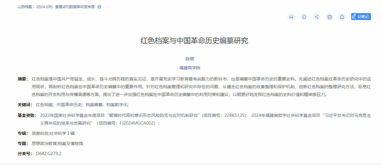近日,beat365官网陈翠教师在北大核心期刊《山西档案》发表文章《红色档案与中国革命历史编纂研究》。