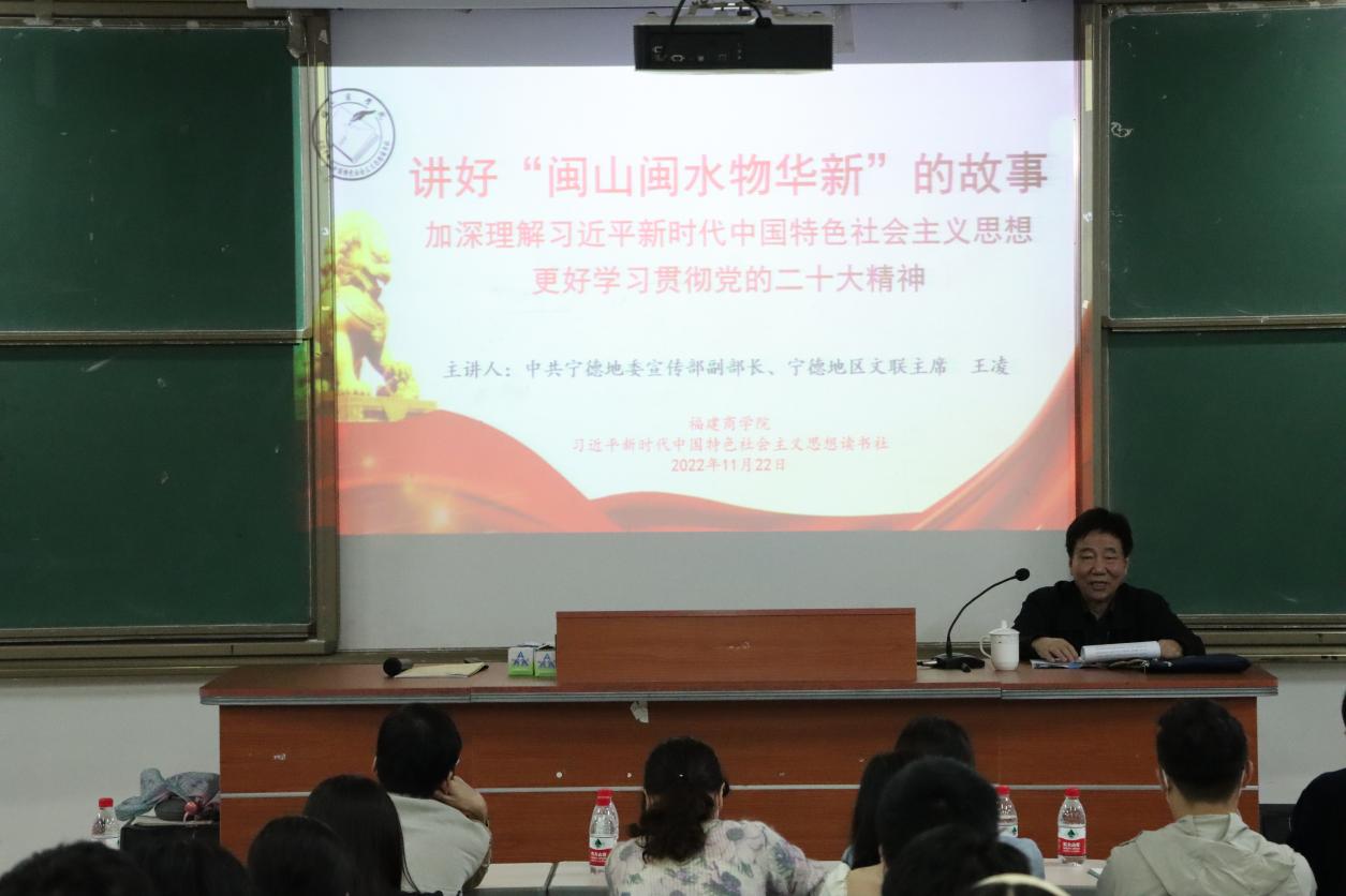 闽山闽水物华新,“习言习语”催人进。11月22日晚,中共宁德地委宣传部原副部长、原宁德地区文联主席王凌研究员受邀莅临beat365官网,为beat365官网师生作了题为《讲好“闽山闽水物华新”的故事,加深理解习近平新时代中国特色社会主义思想,更好学习贯彻党的二十大精神》的专题讲座。校党委副书记吴访益,beat365英国官方网站、机关党委负责同志,学校习近平新时代中国特色社会主义思想学生读书社、教职工读书社社员代表参加。