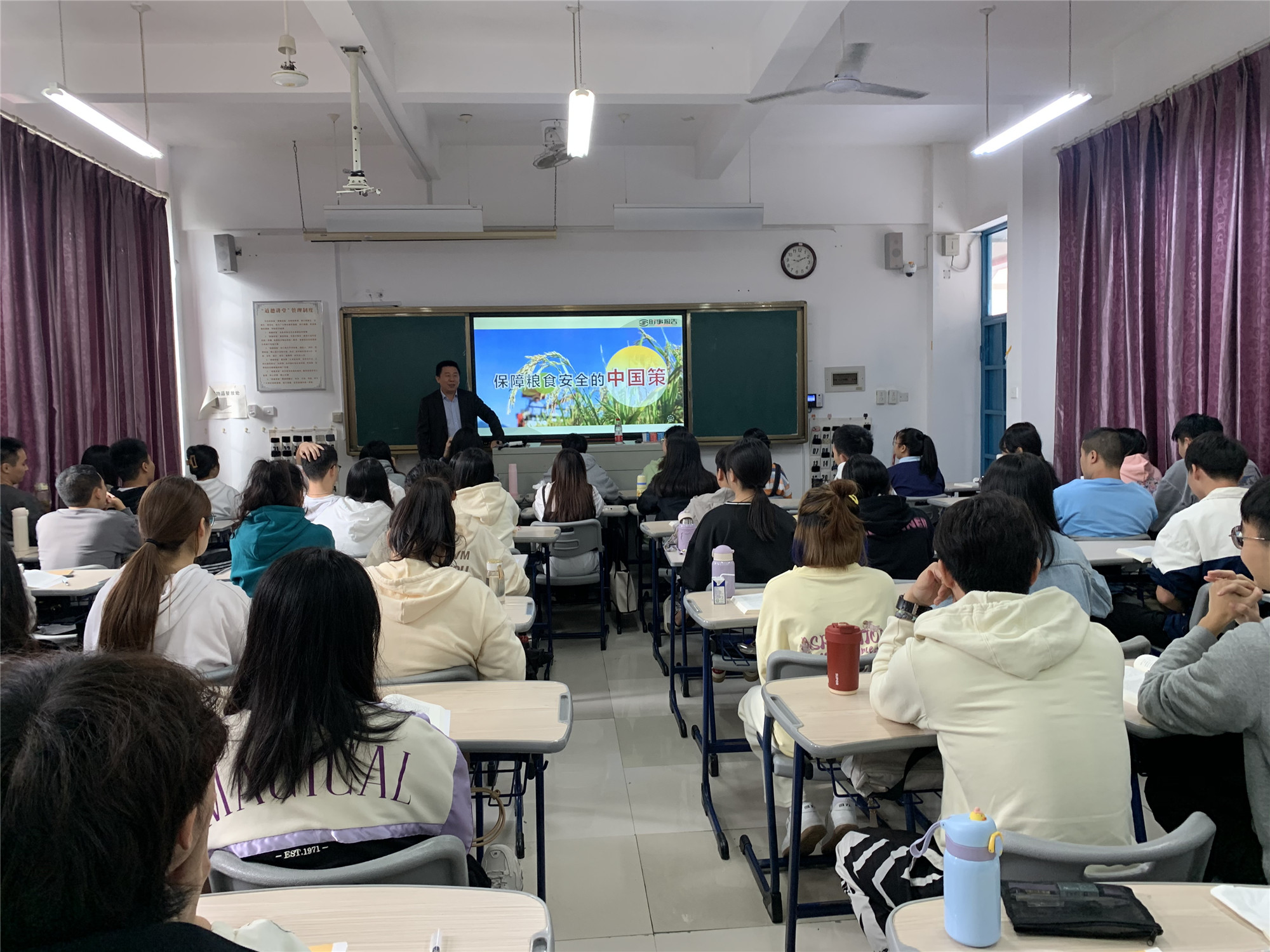 杨晓翔副校长以“世界什么问题最大?““谁来养活中国?”等问题导入主题,阐明了马克思主义经典作家毛泽东、习近平等关于粮食安全问题的重要论述。他以翔实的数据、丰富的素材,阐述了我国保障粮食安全的重要策略:一要自力更生,形势持续向好;二要认清现状,不能轻言过关;三要系统推进,端牢中国饭碗。杨副校长以问题为导向,运用案例分析法讲授,既有图文解说,又注重学理分析,引导学生明确“国以民为本、民以食为天”的重要性,并嘱咐学生要弘扬勤俭节约之风,让勤俭节约内化于心、外化于行。