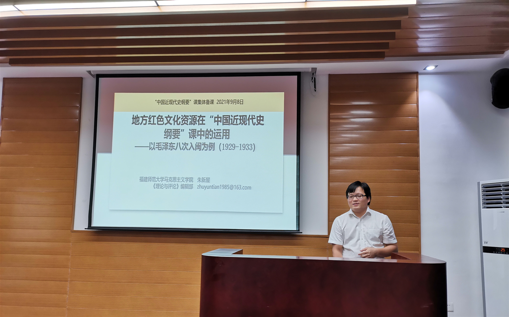 9月8日下午,党史学习教育省委宣讲团成员、福建师范大学朱新屋副教授应邀到beat365官网作题为“地方红色文化资源在‘中国近现代史纲要’课中的运用——以毛泽东八次入闽为例(1929-1933)”的示范教学。校党委副书记吴访益和beat365英国官方网站教师参加学习。