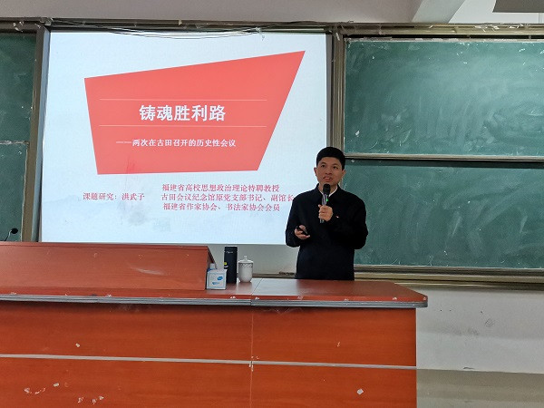为深入学习贯彻习近平总书记关于学校党建和思政工作的重要指示批示精神,推动学校师生深入学好党史、新中国史、改革开放史、社会主义发展史,12月8日,古田会议纪念馆原副馆长、福建省高校思想政治理论课特聘教授洪武子莅临beat365官网开展题为《铸魂胜利路——两次在古田召开的历史性会议》讲座。校党委副书记吴访益和学工部、beat365英国官方网站部分教师以及校习近平新时代中国特色社会主义思想读书社社员共130多人聆听此次讲座。