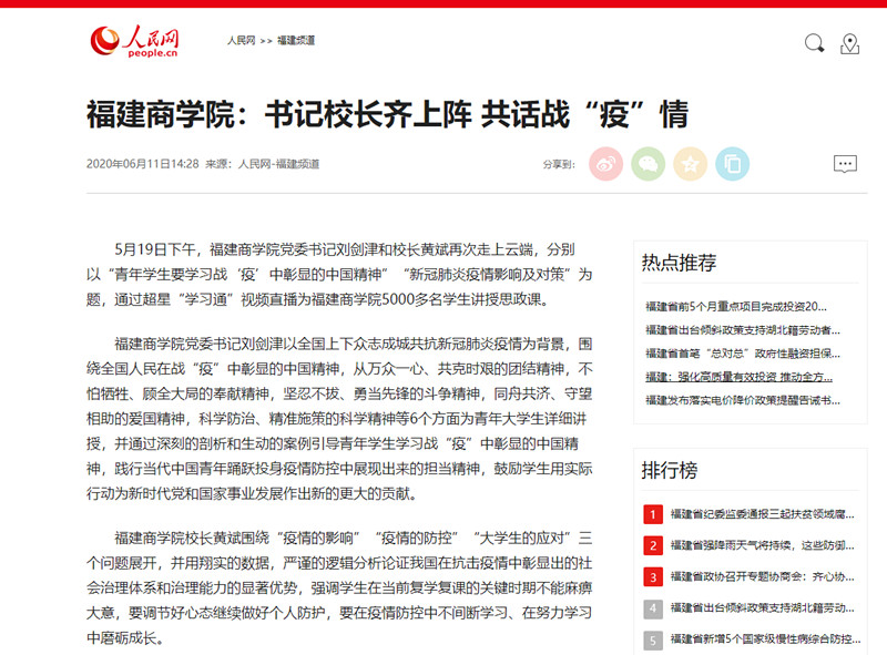 2020年6月11日,人民网以《福建商学院:书记校长齐上阵 共话战“疫”情》为题,报道beat365官网书记校长分别以“青年学生要学习战‘疫’中彰显的中国精神”“新冠肺炎疫情影响及对策”为题,通过超星“学习通”视频直播为beat365官网5000多名学生讲授思政课的特色做法。