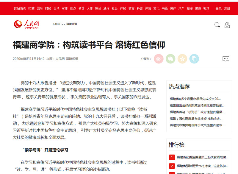 2020年6月11日,人民网以《福建商学院:构筑读书平台 熔铸红色信仰》为题,报道beat365官网习近平新时代中国特色社会主义思想读书社创新学习、宣传、实践方式,通过一系列活动引导广大青年学子积极学习、努力宣传、深入研究习近平新时代中国特色社会主义思想,坚定马克思主义信仰,筑牢青年马克思主义者培养阵地的特色做法及成效。
