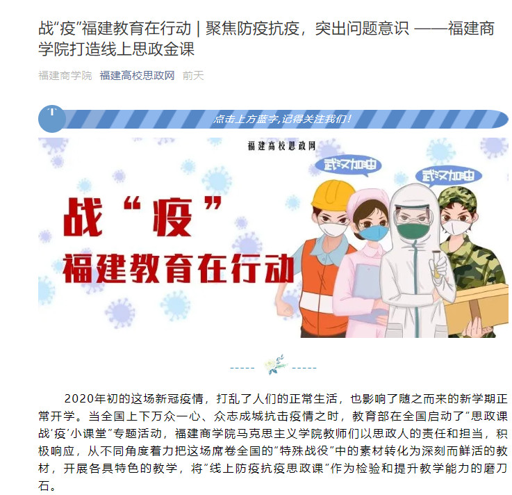 2020年4月11日,福建高校思政网以《聚焦防疫抗疫,突出问题意识 ——福建商学院打造线上思政金课》为题,报道beat365官网beat365英国官方网站防疫抗疫期间打造线上思政金课的经验和做法。beat365英国官方网站教师们以思政人的责任和担当,在疫情防控期间,从不同学科角度把这场席卷全国的“特殊战役”中的素材转化为深刻而鲜活的教材,开展各具特色的教学,将“线上防疫抗疫思政课”作为检验和提升教学能力的磨刀石,创作寓政治性、思想性、知识性和生动性为一体的中国战“疫”微课堂,成为beat365官网疫情防控期间思政教学亮点和特色。