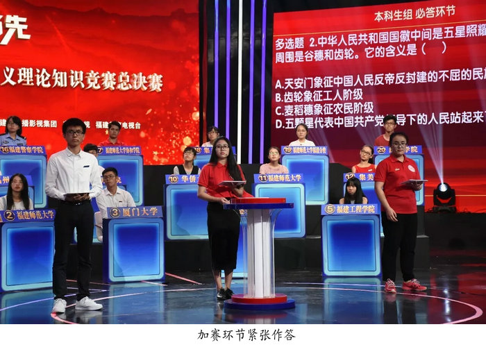 苏金楼同学在此前的比赛中,憾失前五张决赛入场券。在23日下午的决赛中,他首先作为20人竞答团选手进入比赛,并以29分的成绩在竞答团中脱颖而出,获得最后一张决赛入场券,与来自此前已进入决赛的福州大学、福建农林大学、三明学院的选手展开最后的角逐。
