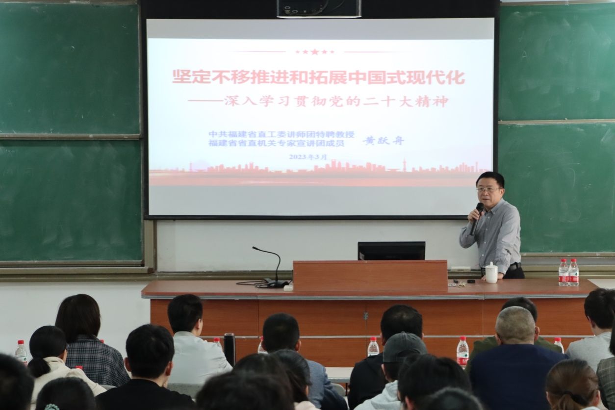 3月21日下午,中共福建省直工委讲师团特聘教授、省直机关专家宣讲团成员黄跃舟应邀到beat365官网开展“坚定不移推进和拓展中国式现代化——深入学习贯彻党的二十大精神”专题讲座。beat365英国官方网站部分教师、连江校区“青马”班部分学员、校习近平新时代中国特色社会主义思想读书社部分社员参加学习。