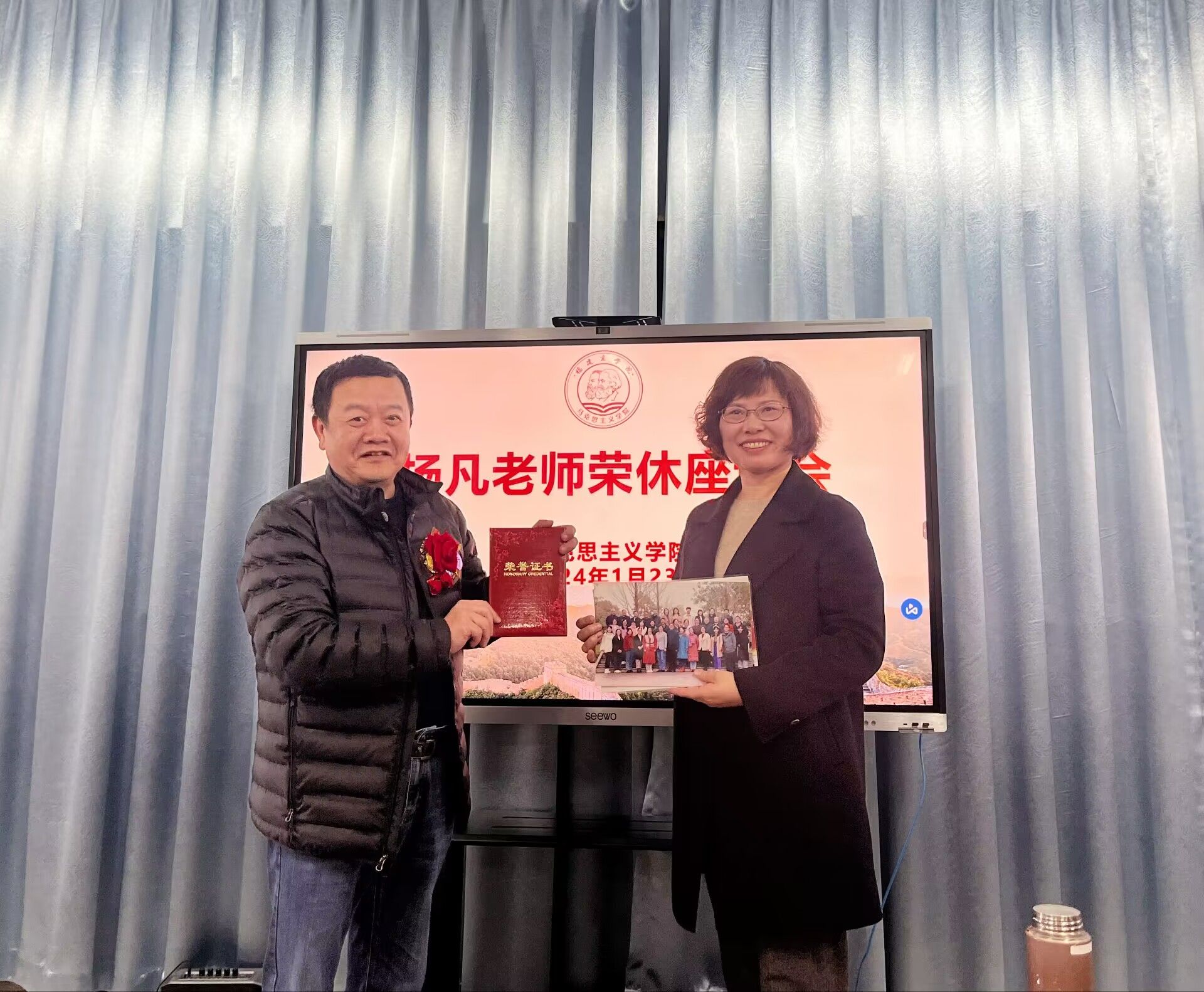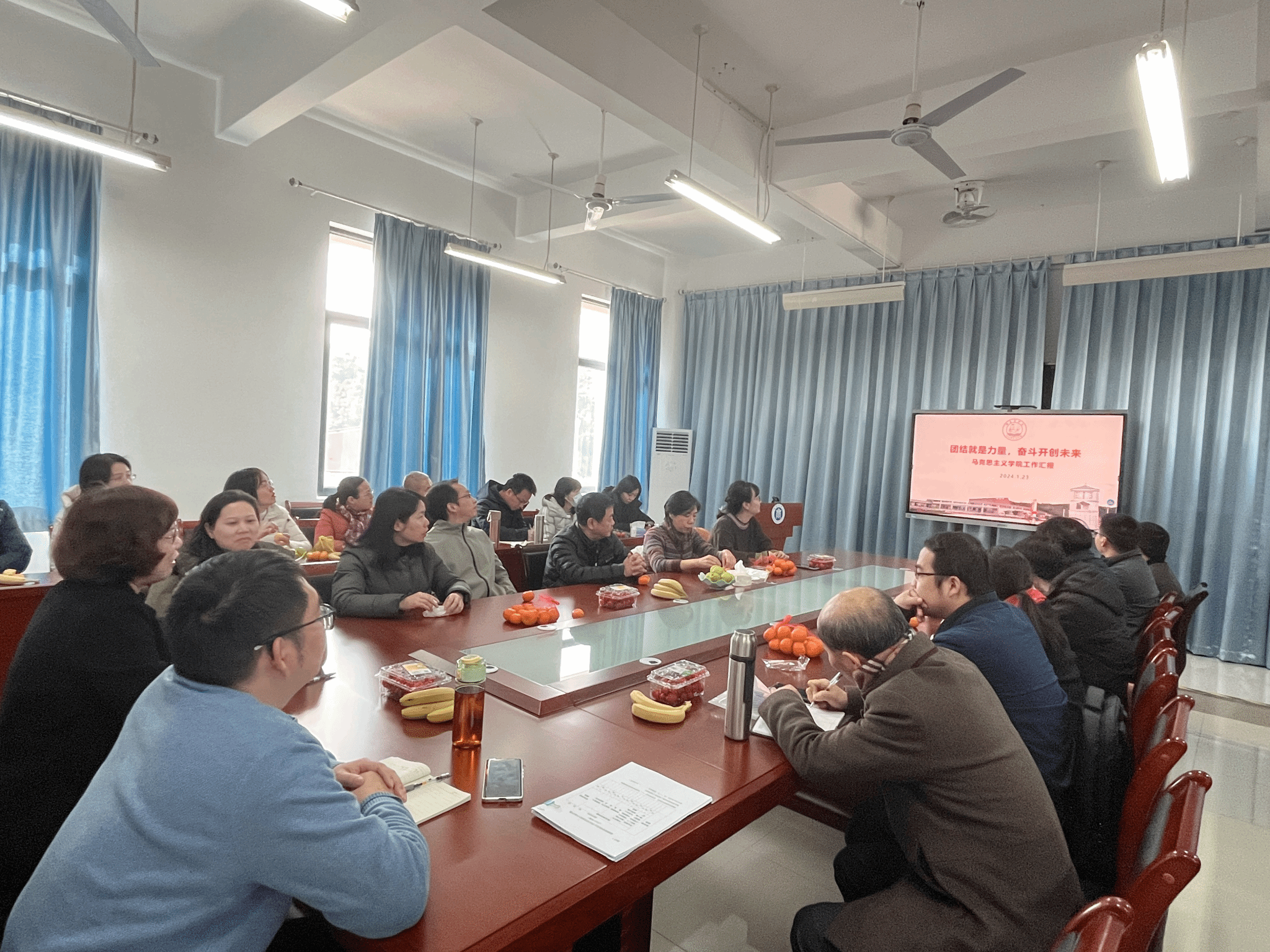 2024年1月23日下午,beat365官网召开本学期期末工作安排会议暨杨凡老师荣休欢送会。beat365英国官方网站全体教师参加。