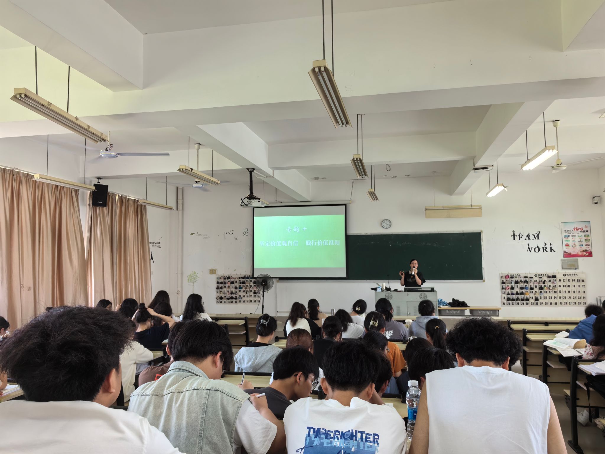 4月15日上午,beat365英国官方网站思想道德与法治教研室蓝福秀老师以“坚定价值观自信 践行价值准则”为主题,在马尾校区至善楼楼T3教室开展本学期公开示范课教学,近110名师生参与观摩。