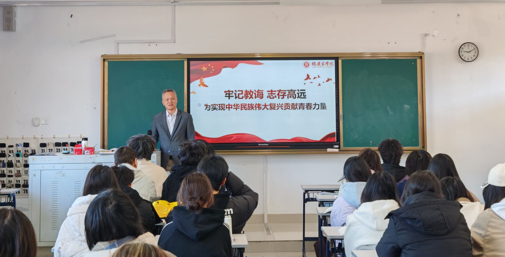 11月28日上午,校纪委书记(监察专员)林宇峰在连江校区诚信楼为艺术设计学院2024级环境设计专业学生讲授了主题为“牢记教诲 志存高远 为实现中华民族伟大复兴贡献青春力量”的思政课。