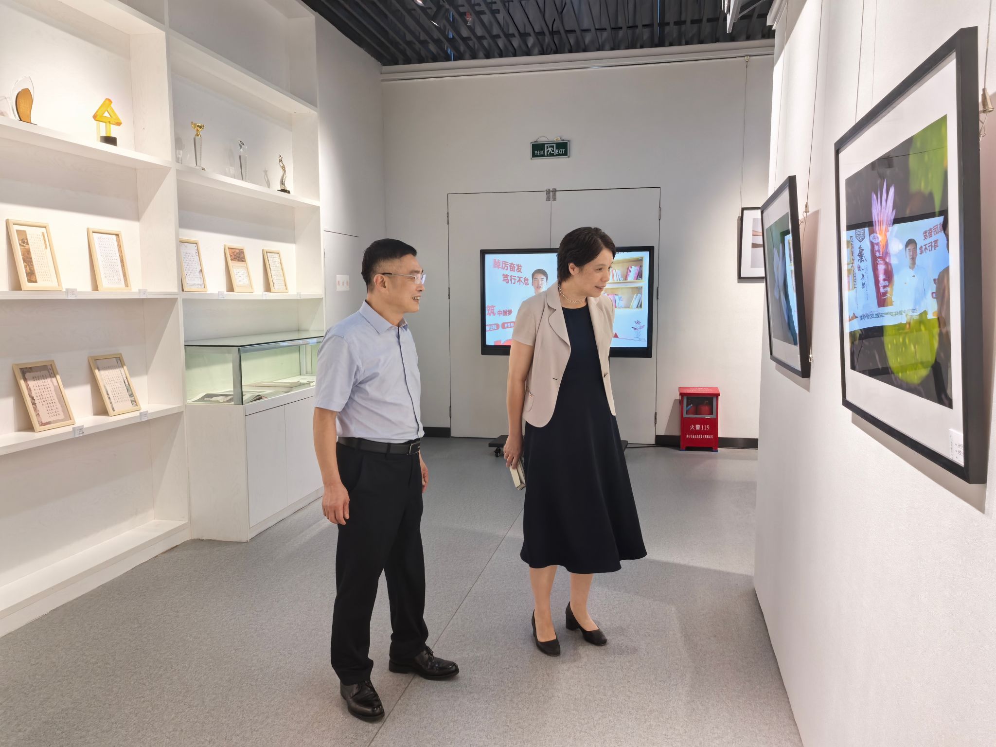 图为校党委书记吴访益、校长程灵参观廉洁文化作品展