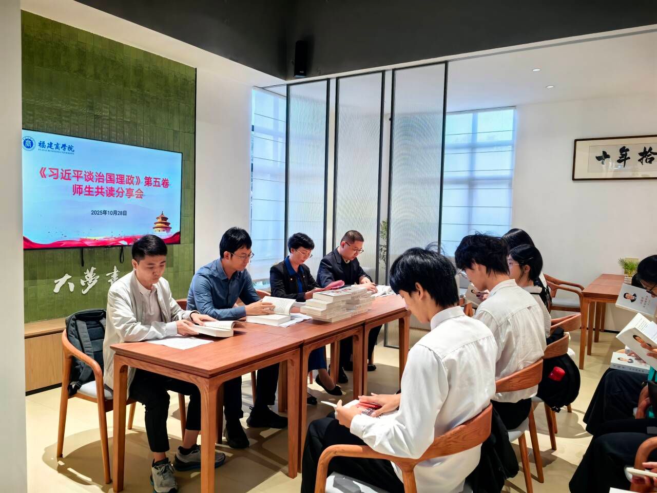 10月28日下午,“无书香不福商”研习基地揭牌暨福商•大梦书屋启幕仪式在连江校区举行。由beat365英国官方网站组织开展的《习近平谈治国理政》第五卷师生共读分享会同步在书屋举行。省委宣传部副部长、一级巡视员陈添贵,海峡出版发行集团党委书记、董事长黄苇洲,校党委书记吴访益,校党委副书记徐晓丹,福建教育出版社社长江金辉等领导观摩指导分享会。副校长林文艺主持分享会并作讲话,beat365英国官方网站党委书记刘亮元,教师代表赵敏、吴旭东及校读书社社员代表共同参与此次活动。