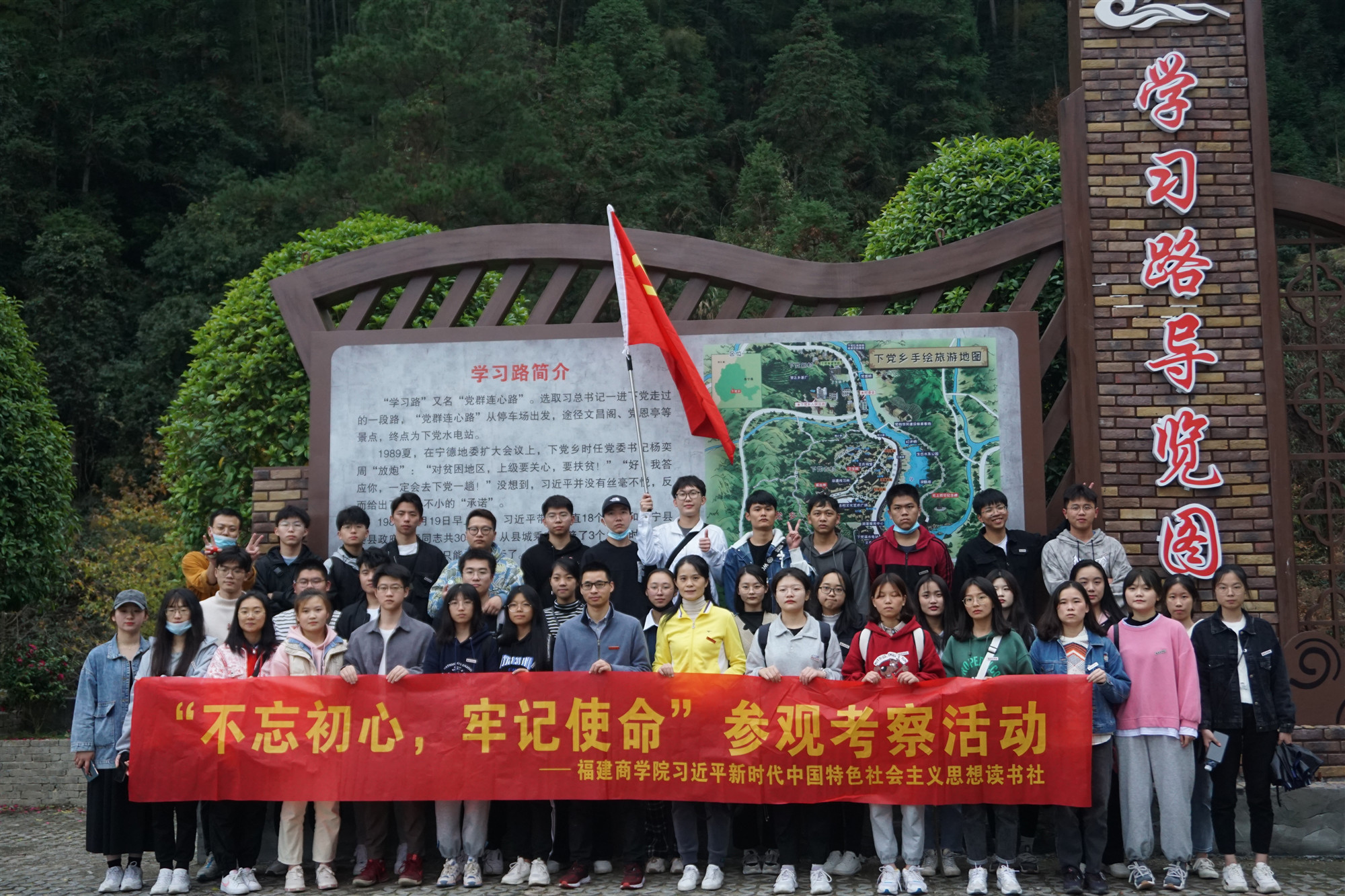 全体师生从平溪镇屏峰村出发,穿越山间羊肠小道,徒步走完党员干部与人民群众心连心、共奔小康的7.5公里“党群连心路”,全程历时约3小时,切身体会习近平总书记当年跋山涉水、披荆斩棘的艰辛,深刻理解习近平总书记的爱民为民情怀和脱贫攻坚的担当精神;下党乡原党委副书记刘明华为师生们作了《不忘初心 攻坚克难》专题讲座,他结合自身经历带领大家回顾了下党人民在党的领导下,走出一条具有闽东特色的乡村振兴之路;师生们参观了“难忘下党”主题展,师生们真切感受到下党脱贫攻坚、共奔小康的光辉历程和巨大成就。