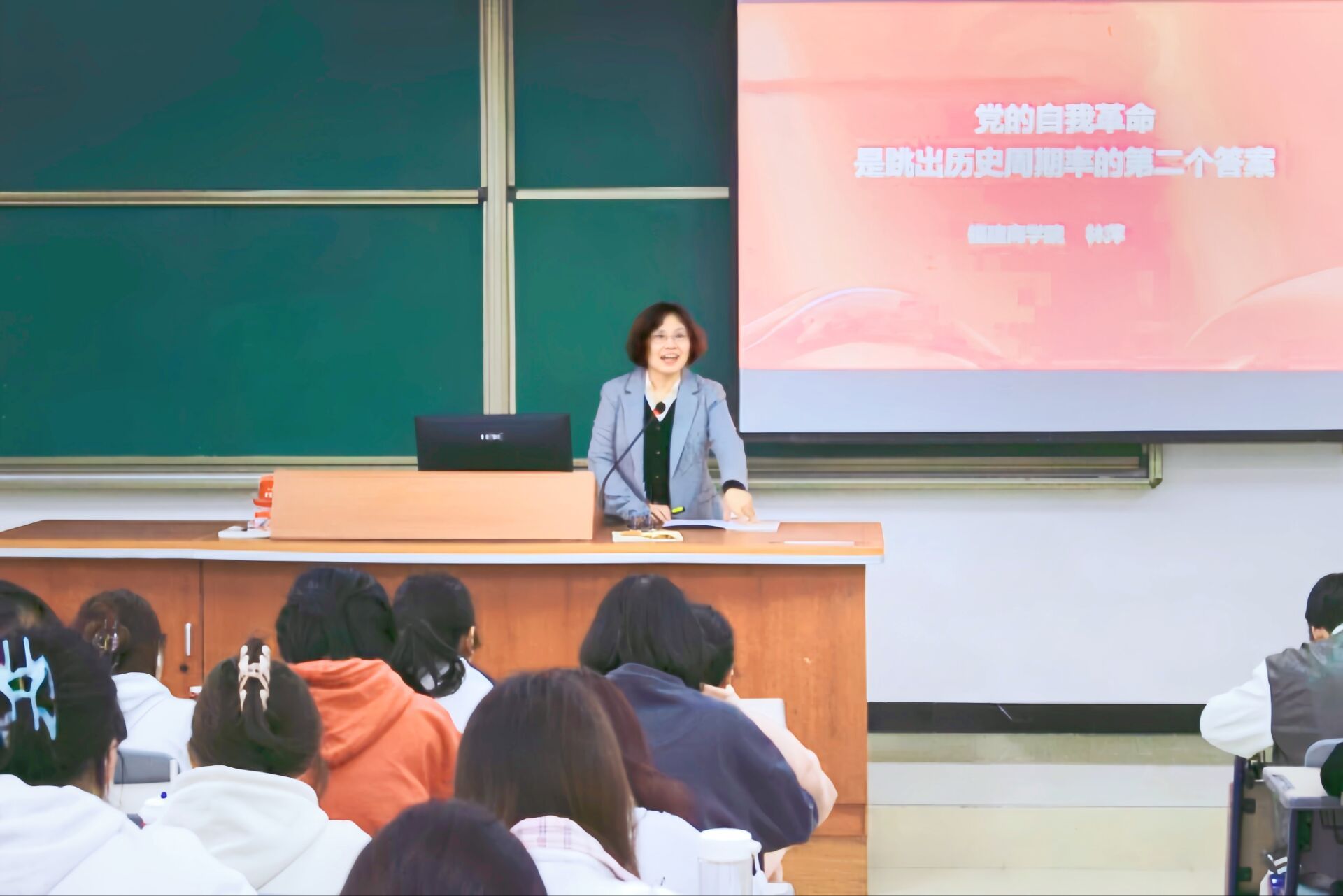 活动伊始,林萍教授围绕“两个答案”的提出、习近平总书记关于“第二个答案”的重要论述等方面进行了深入浅出的讲解,同时也阐述了“九个坚持”的规律性认识和“六个必要”的原则性要求,强调自我革命是党跳出治乱兴衰历史周期率的第二个答案。林萍教授还结合史实资料,生动讲述了党的十八大以来,以习近平同志为核心的党中央深入推进全面从严治党,不断探索、勇于自我革命,最终找到了跳出历史周期率的新路。她强调,自我革命是党百余年来淬炼而成的鲜明品格,是新时代党的建设领域特定内涵的概念。莘莘学子应深刻地认识到党的自我革命的重要性和必要性,坚定为党和国家发展添砖加瓦的信心和决心。