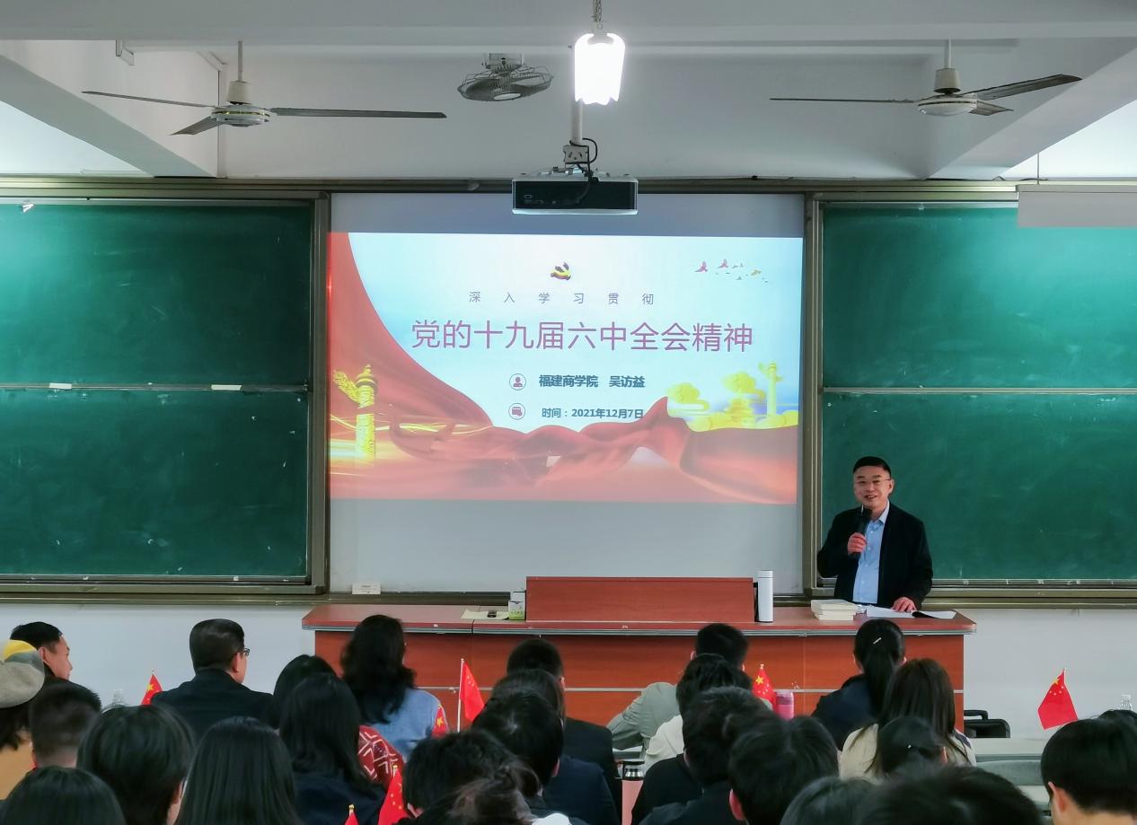 12月7日下午,校党委副书记吴访益在连江校区诚信楼中阶4教室作题为“深入学习贯彻党的十九届六中全会精神暨学习福建省第十一次党代会精神”的主题宣讲,有关处室负责人、beat365英国官方网站全体教职工、校习近平新时代中国特色社会主义思想读书社全体成员共120多人参加了宣讲会。