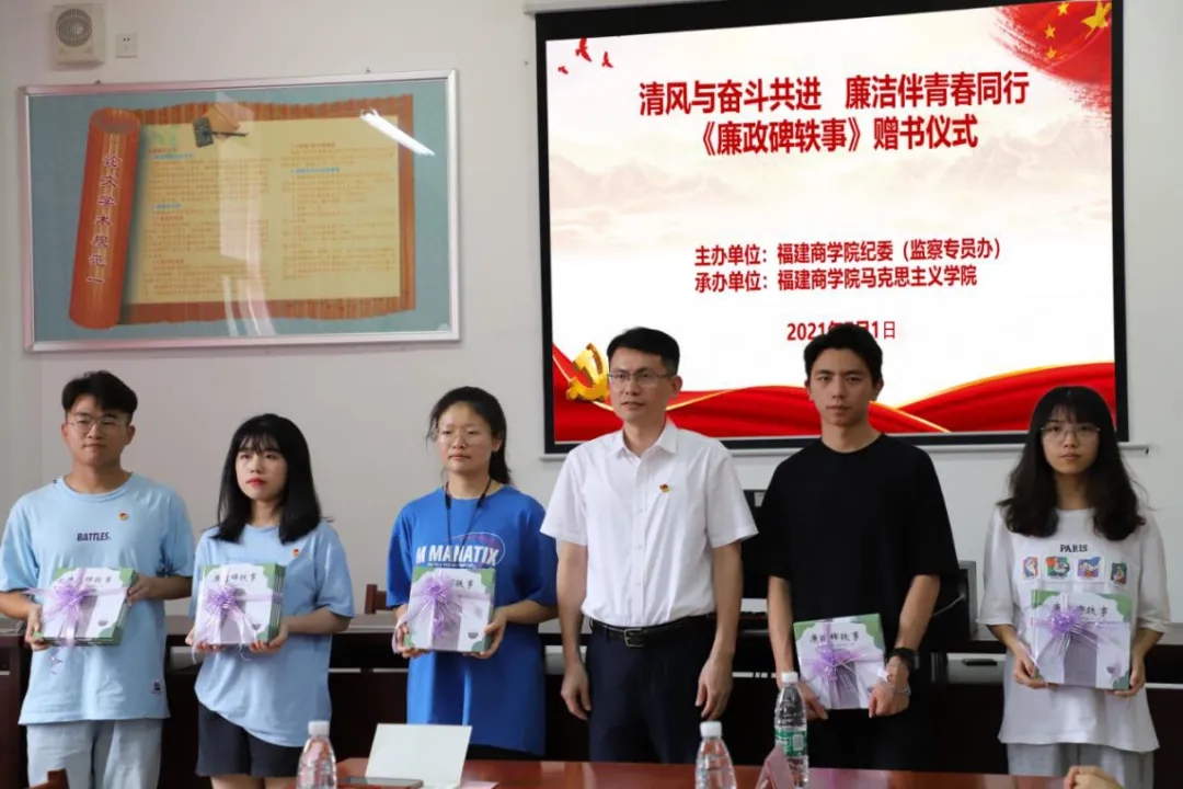 7月1日下午,校纪委(监察专员办)在beat365官网习近平新时代中国特色社会主义思想读书社活动室举办“清风与奋斗并进 廉洁伴青春同行”赠书活动,校纪委书记、监察专员黄身勇向读书社学员代表赠送《廉政碑轶事》绘本。beat365英国官方网站党政负责人、艺术设计学院党组织负责人和校纪委综合室、纪检监察室等相关部门负责人参加活动。