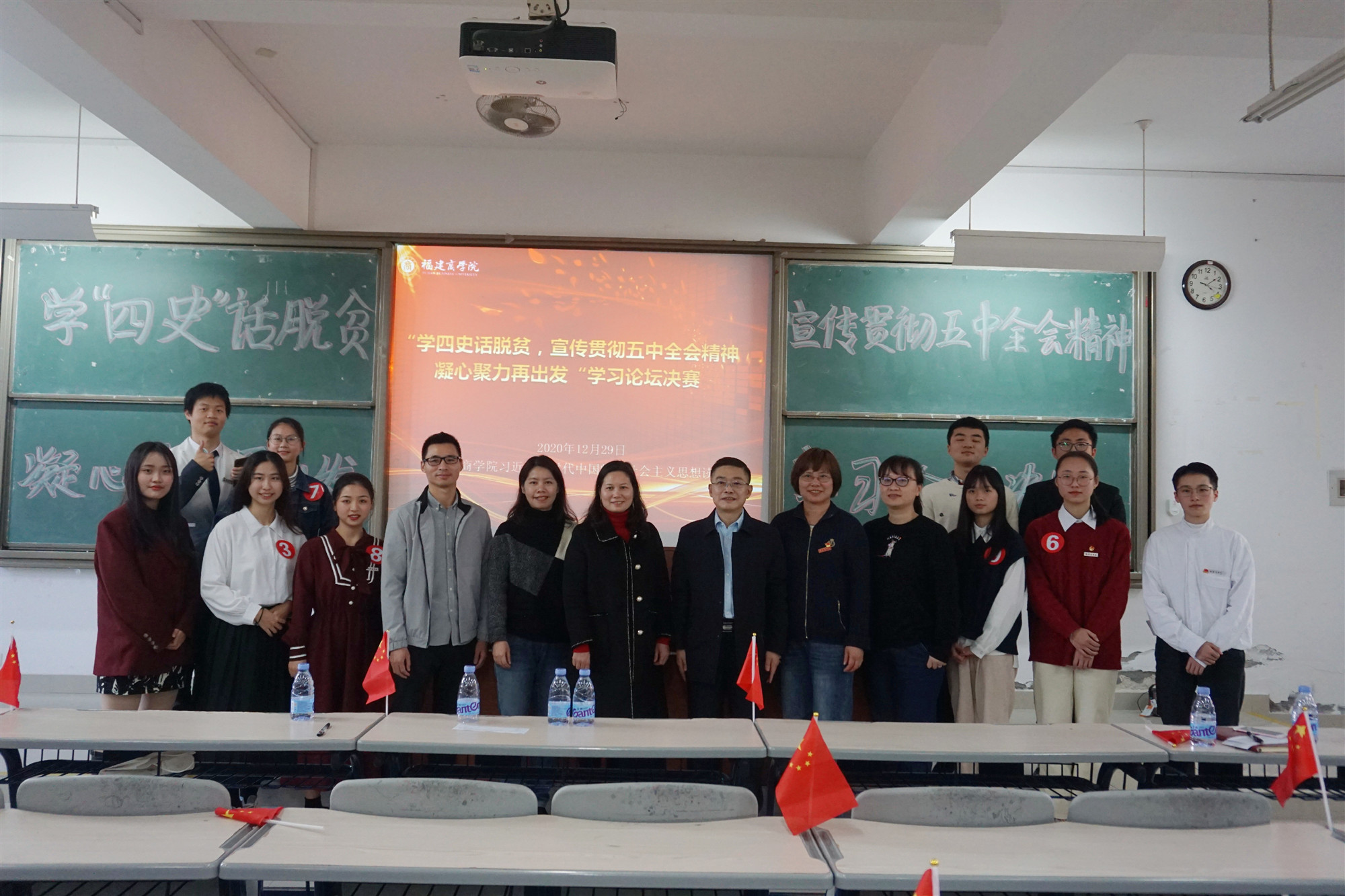 近日,校习近平新时代中国特色社会主义思想读书社在连江校区举办“学‘四史’话脱贫 宣传贯彻党的十九届五中全会精神 凝心聚力再出发”学习论坛决赛,校党委副书记吴访益、beat365英国官方网站部分教师以及读书社社员共100多人参加此次活动。